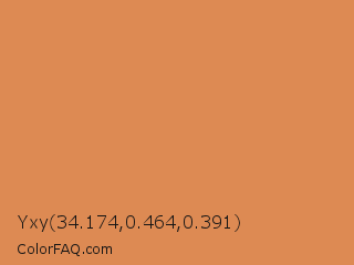 Yxy 34.174,0.464,0.391 Color is a normal orange color and the nearest color is Persian Orange #d99058. Hex code #dd8a53 and RGB value is rgb(221,138,83). In RGB color space, this color is composed of 87% red, 54% green, 33% blue, In CMYK color space, this color is composed of 0% cyan, 38% magenta, 62% yellow , 13% black , In HSL color space, this color has a hue angle of 24° , 67% saturation and 60% lightness.