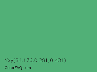 Yxy 34.176,0.281,0.431 Color is a normal green color and the nearest color is Aqua Forest #5fa777. Hex code #51b077 and RGB value is rgb(81,176,119). In RGB color space, this color is composed of 32% red, 69% green, 47% blue, In CMYK color space, this color is composed of 54% cyan, 0% magenta, 32% yellow , 31% black , In HSL color space, this color has a hue angle of 144° , 38% saturation and 50% lightness.