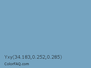 Yxy 34.183,0.252,0.285 Color is a light blue color and the nearest color is Air Superiority Blue #72a0c1. Hex code #75a4c1 and RGB value is rgb(117,164,193). In RGB color space, this color is composed of 46% red, 64% green, 76% blue, In CMYK color space, this color is composed of 39% cyan, 15% magenta, 0% yellow , 24% black , In HSL color space, this color has a hue angle of 203° , 38% saturation and 61% lightness.