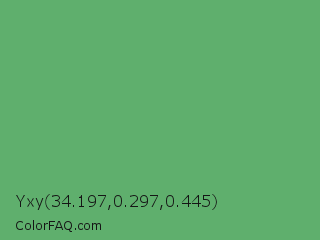Yxy 34.197,0.297,0.445 Color is a normal green color and the nearest color is Fern #63b76c. Hex code #5faf6d and RGB value is rgb(95,175,109). In RGB color space, this color is composed of 37% red, 69% green, 43% blue, In CMYK color space, this color is composed of 46% cyan, 0% magenta, 38% yellow , 31% black , In HSL color space, this color has a hue angle of 131° , 33% saturation and 53% lightness.