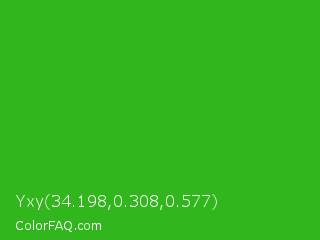 Yxy 34.198,0.308,0.577 Color is a normal green color and the nearest color is Wageningen Green #34b233. Hex code #32b61d and RGB value is rgb(50,182,29). In RGB color space, this color is composed of 20% red, 71% green, 11% blue, In CMYK color space, this color is composed of 73% cyan, 0% magenta, 84% yellow , 29% black , In HSL color space, this color has a hue angle of 112° , 73% saturation and 41% lightness.