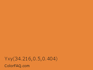 Yxy 34.216,0.5,0.404 Color is a normal orange color and the nearest color is Jaffa #ef863f. Hex code #e88538 and RGB value is rgb(232,133,56). In RGB color space, this color is composed of 91% red, 52% green, 22% blue, In CMYK color space, this color is composed of 0% cyan, 43% magenta, 76% yellow , 9% black , In HSL color space, this color has a hue angle of 26° , 79% saturation and 56% lightness.