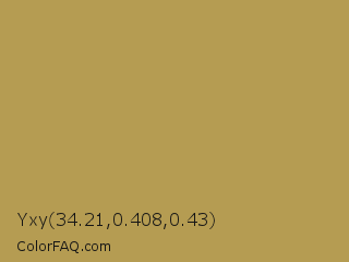Yxy 34.21,0.408,0.43 Color is a normal orange color and the nearest color is Husk #b7a458. Hex code #b59c52 and RGB value is rgb(181,156,82). In RGB color space, this color is composed of 71% red, 61% green, 32% blue, In CMYK color space, this color is composed of 0% cyan, 14% magenta, 55% yellow , 29% black , In HSL color space, this color has a hue angle of 45° , 40% saturation and 52% lightness.