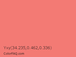 Yxy 34.235,0.462,0.336 Color is a light red color and the nearest color is Salmon #fa8072. Hex code #f37a74 and RGB value is rgb(243,122,116). In RGB color space, this color is composed of 95% red, 48% green, 45% blue, In CMYK color space, this color is composed of 0% cyan, 50% magenta, 52% yellow , 5% black , In HSL color space, this color has a hue angle of 3° , 84% saturation and 70% lightness.
