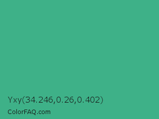 Yxy 34.246,0.26,0.402 Color is a normal green color and the nearest color is Mint #3eb489. Hex code #3eb188 and RGB value is rgb(62,177,136). In RGB color space, this color is composed of 24% red, 69% green, 53% blue, In CMYK color space, this color is composed of 65% cyan, 0% magenta, 23% yellow , 31% black , In HSL color space, this color has a hue angle of 159° , 48% saturation and 47% lightness.