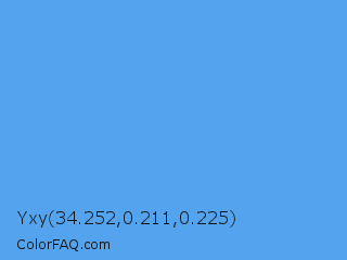 Yxy 34.252,0.211,0.225 Color is a light blue color and the nearest color is Blue Jeans #5dadec. Hex code #53a3ee and RGB value is rgb(83,163,238). In RGB color space, this color is composed of 33% red, 64% green, 93% blue, In CMYK color space, this color is composed of 65% cyan, 32% magenta, 0% yellow , 7% black , In HSL color space, this color has a hue angle of 209° , 82% saturation and 63% lightness.