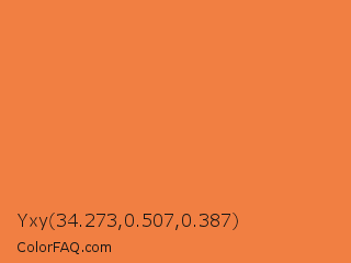 Yxy 34.273,0.507,0.387 Color is a normal orange color and the nearest color is Jaffa #ef863f. Hex code #f17f42 and RGB value is rgb(241,127,66). In RGB color space, this color is composed of 95% red, 50% green, 26% blue, In CMYK color space, this color is composed of 0% cyan, 47% magenta, 73% yellow , 5% black , In HSL color space, this color has a hue angle of 21° , 86% saturation and 60% lightness.