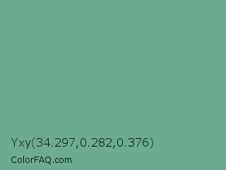 Yxy 34.297,0.282,0.376 Color is a normal green color and the nearest color is Silver Tree #66b58f. Hex code #6cab8f and RGB value is rgb(108,171,143). In RGB color space, this color is composed of 42% red, 67% green, 56% blue, In CMYK color space, this color is composed of 37% cyan, 0% magenta, 16% yellow , 33% black , In HSL color space, this color has a hue angle of 153° , 27% saturation and 55% lightness.