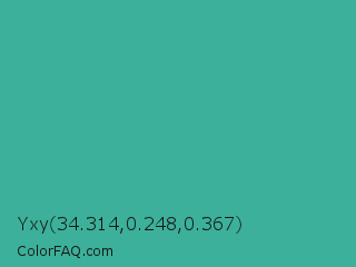 Yxy 34.314,0.248,0.367 Color is a normal cyan color and the nearest color is Keppel #3ab09e. Hex code #3cb09a and RGB value is rgb(60,176,154). In RGB color space, this color is composed of 24% red, 69% green, 60% blue, In CMYK color space, this color is composed of 66% cyan, 0% magenta, 13% yellow , 31% black , In HSL color space, this color has a hue angle of 169° , 49% saturation and 46% lightness.