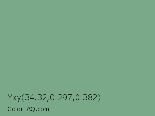 Yxy 34.32,0.297,0.382 Color is a normal green color and the nearest color is Bay Leaf #7da98d. Hex code #7aa989 and RGB value is rgb(122,169,137). In RGB color space, this color is composed of 48% red, 66% green, 54% blue, In CMYK color space, this color is composed of 28% cyan, 0% magenta, 19% yellow , 34% black , In HSL color space, this color has a hue angle of 139° , 21% saturation and 57% lightness.