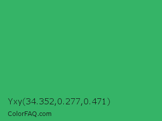 Yxy 34.352,0.277,0.471 Color is a normal green color and the nearest color is Medium Sea Green #3cb371. Hex code #35b467 and RGB value is rgb(53,180,103). In RGB color space, this color is composed of 21% red, 71% green, 40% blue, In CMYK color space, this color is composed of 71% cyan, 0% magenta, 43% yellow , 29% black , In HSL color space, this color has a hue angle of 144° , 55% saturation and 46% lightness.