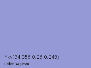 Yxy 34.356,0.26,0.248 Color is a light blue color and the nearest color is Ceil #92a1cf. Hex code #959ad6 and RGB value is rgb(149,154,214). In RGB color space, this color is composed of 58% red, 60% green, 84% blue, In CMYK color space, this color is composed of 30% cyan, 28% magenta, 0% yellow , 16% black , In HSL color space, this color has a hue angle of 235° , 44% saturation and 71% lightness.