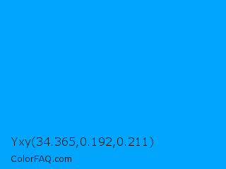 Yxy 34.365,0.192,0.211 Color is a normal blue color and the nearest color is Vivid Cerulean #00aaee. Hex code #01a6fc and RGB value is rgb(1,166,252). In RGB color space, this color is composed of 0% red, 65% green, 99% blue, In CMYK color space, this color is composed of 100% cyan, 34% magenta, 0% yellow , 1% black , In HSL color space, this color has a hue angle of 201° , 99% saturation and 50% lightness.
