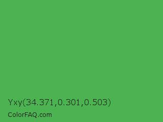 Yxy 34.371,0.301,0.503 Color is a normal green color and the nearest color is Chateau Green #40a860. Hex code #4cb351 and RGB value is rgb(76,179,81). In RGB color space, this color is composed of 30% red, 70% green, 32% blue, In CMYK color space, this color is composed of 58% cyan, 0% magenta, 55% yellow , 30% black , In HSL color space, this color has a hue angle of 123° , 40% saturation and 50% lightness.