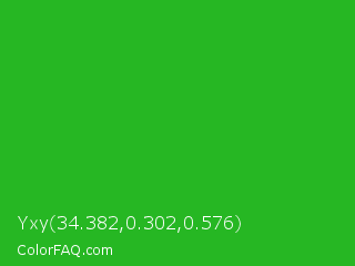 Yxy 34.382,0.302,0.576 Color is a normal green color and the nearest color is Wageningen Green #34b233. Hex code #26b723 and RGB value is rgb(38,183,35). In RGB color space, this color is composed of 15% red, 72% green, 14% blue, In CMYK color space, this color is composed of 79% cyan, 0% magenta, 81% yellow , 28% black , In HSL color space, this color has a hue angle of 119° , 68% saturation and 43% lightness.