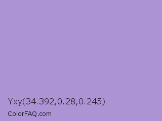 Yxy 34.392,0.28,0.245 Color is a light violet color and the nearest color is East Side #ac91ce. Hex code #ac93d4 and RGB value is rgb(172,147,212). In RGB color space, this color is composed of 67% red, 58% green, 83% blue, In CMYK color space, this color is composed of 19% cyan, 31% magenta, 0% yellow , 17% black , In HSL color space, this color has a hue angle of 263° , 43% saturation and 70% lightness.