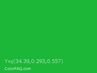 Yxy 34.39,0.293,0.557 Color is a normal green color and the nearest color is Wageningen Green #34b233. Hex code #1cb737 and RGB value is rgb(28,183,55). In RGB color space, this color is composed of 11% red, 72% green, 22% blue, In CMYK color space, this color is composed of 85% cyan, 0% magenta, 70% yellow , 28% black , In HSL color space, this color has a hue angle of 130° , 73% saturation and 41% lightness.