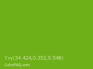 Yxy 34.424,0.352,0.548 Color is a normal green color and the nearest color is Christi #67a712. Hex code #6eb017 and RGB value is rgb(110,176,23). In RGB color space, this color is composed of 43% red, 69% green, 9% blue, In CMYK color space, this color is composed of 38% cyan, 0% magenta, 87% yellow , 31% black , In HSL color space, this color has a hue angle of 86° , 77% saturation and 39% lightness.