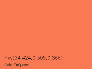 Yxy 34.424,0.505,0.366 Color is a light red color and the nearest color is Coral #ff7f50. Hex code #f97952 and RGB value is rgb(249,121,82). In RGB color space, this color is composed of 98% red, 47% green, 32% blue, In CMYK color space, this color is composed of 0% cyan, 51% magenta, 67% yellow , 2% black , In HSL color space, this color has a hue angle of 14° , 93% saturation and 65% lightness.