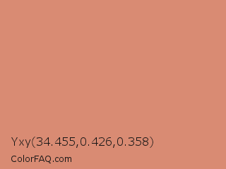 Yxy 34.455,0.426,0.358 Color is a light red color and the nearest color is Burning Sand #d99376. Hex code #d98b73 and RGB value is rgb(217,139,115). In RGB color space, this color is composed of 85% red, 55% green, 45% blue, In CMYK color space, this color is composed of 0% cyan, 36% magenta, 47% yellow , 15% black , In HSL color space, this color has a hue angle of 14° , 57% saturation and 65% lightness.