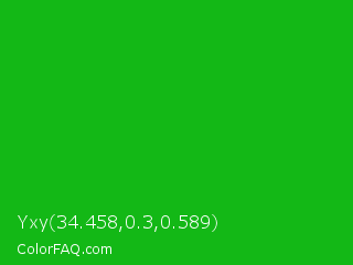 Yxy 34.458,0.3,0.589 Color is a normal green color and the nearest color is Vivid Malachite #00cc33. Hex code #13b816 and RGB value is rgb(19,184,22). In RGB color space, this color is composed of 7% red, 72% green, 9% blue, In CMYK color space, this color is composed of 90% cyan, 0% magenta, 88% yellow , 28% black , In HSL color space, this color has a hue angle of 121° , 81% saturation and 40% lightness.