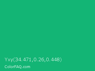 Yxy 34.471,0.26,0.448 Color is a normal green color and the nearest color is Green Crayola #1cac78. Hex code #13b575 and RGB value is rgb(19,181,117). In RGB color space, this color is composed of 7% red, 71% green, 46% blue, In CMYK color space, this color is composed of 90% cyan, 0% magenta, 35% yellow , 29% black , In HSL color space, this color has a hue angle of 156° , 81% saturation and 39% lightness.