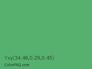 Yxy 34.48,0.29,0.45 Color is a normal green color and the nearest color is Fern #63b76c. Hex code #55b16d and RGB value is rgb(85,177,109). In RGB color space, this color is composed of 33% red, 69% green, 43% blue, In CMYK color space, this color is composed of 52% cyan, 0% magenta, 38% yellow , 31% black , In HSL color space, this color has a hue angle of 136° , 37% saturation and 51% lightness.