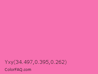 Yxy 34.497,0.395,0.262 Color is a light rose color and the nearest color is Hot Pink #ff69b4. Hex code #f770b0 and RGB value is rgb(247,112,176). In RGB color space, this color is composed of 97% red, 44% green, 69% blue, In CMYK color space, this color is composed of 0% cyan, 55% magenta, 29% yellow , 3% black , In HSL color space, this color has a hue angle of 332° , 89% saturation and 70% lightness.