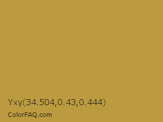 Yxy 34.504,0.43,0.444 Color is a normal orange color and the nearest color is Brass #b5a642. Hex code #bc9b40 and RGB value is rgb(188,155,64). In RGB color space, this color is composed of 74% red, 61% green, 25% blue, In CMYK color space, this color is composed of 0% cyan, 18% magenta, 66% yellow , 26% black , In HSL color space, this color has a hue angle of 44° , 49% saturation and 49% lightness.
