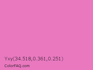 Yxy 34.518,0.361,0.251 Color is a light magenta color and the nearest color is Persian Pink #f77fbe. Hex code #e978bf and RGB value is rgb(233,120,191). In RGB color space, this color is composed of 91% red, 47% green, 75% blue, In CMYK color space, this color is composed of 0% cyan, 48% magenta, 18% yellow , 9% black , In HSL color space, this color has a hue angle of 322° , 72% saturation and 69% lightness.
