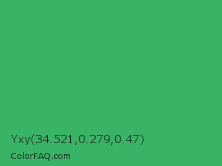 Yxy 34.521,0.279,0.47 Color is a normal green color and the nearest color is Medium Sea Green #3cb371. Hex code #39b467 and RGB value is rgb(57,180,103). In RGB color space, this color is composed of 22% red, 71% green, 40% blue, In CMYK color space, this color is composed of 68% cyan, 0% magenta, 43% yellow , 29% black , In HSL color space, this color has a hue angle of 142° , 52% saturation and 46% lightness.