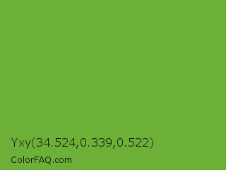 Yxy 34.524,0.339,0.522 Color is a normal green color and the nearest color is Green RYB #66b032. Hex code #6cb038 and RGB value is rgb(108,176,56). In RGB color space, this color is composed of 42% red, 69% green, 22% blue, In CMYK color space, this color is composed of 39% cyan, 0% magenta, 68% yellow , 31% black , In HSL color space, this color has a hue angle of 94° , 52% saturation and 45% lightness.