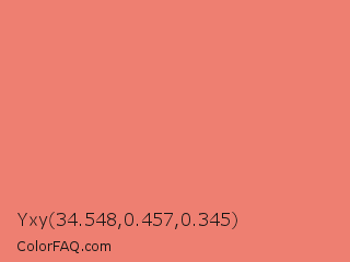 Yxy 34.548,0.457,0.345 Color is a light red color and the nearest color is Salmon #fa8072. Hex code #ee7f71 and RGB value is rgb(238,127,113). In RGB color space, this color is composed of 93% red, 50% green, 44% blue, In CMYK color space, this color is composed of 0% cyan, 47% magenta, 53% yellow , 7% black , In HSL color space, this color has a hue angle of 7° , 79% saturation and 69% lightness.