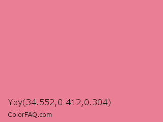 Yxy 34.552,0.412,0.304 Color is a light red color and the nearest color is Bright Blush #e47698. Hex code #ea7e94 and RGB value is rgb(234,126,148). In RGB color space, this color is composed of 92% red, 49% green, 58% blue, In CMYK color space, this color is composed of 0% cyan, 46% magenta, 37% yellow , 8% black , In HSL color space, this color has a hue angle of 348° , 72% saturation and 71% lightness.