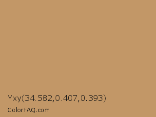 Yxy 34.582,0.407,0.393 Color is a normal orange color and the nearest color is Desert Camel #c19a6b. Hex code #c29767 and RGB value is rgb(194,151,103). In RGB color space, this color is composed of 76% red, 59% green, 40% blue, In CMYK color space, this color is composed of 0% cyan, 22% magenta, 47% yellow , 24% black , In HSL color space, this color has a hue angle of 32° , 43% saturation and 58% lightness.
