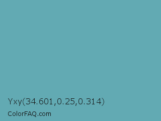 Yxy 34.601,0.25,0.314 Color is a normal cyan color and the nearest color is Tradewind #5fb3ac. Hex code #62aab3 and RGB value is rgb(98,170,179). In RGB color space, this color is composed of 38% red, 67% green, 70% blue, In CMYK color space, this color is composed of 45% cyan, 5% magenta, 0% yellow , 30% black , In HSL color space, this color has a hue angle of 187° , 35% saturation and 54% lightness.