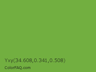 Yxy 34.608,0.341,0.508 Color is a normal green color and the nearest color is Green RYB #66b032. Hex code #72af40 and RGB value is rgb(114,175,64). In RGB color space, this color is composed of 45% red, 69% green, 25% blue, In CMYK color space, this color is composed of 35% cyan, 0% magenta, 63% yellow , 31% black , In HSL color space, this color has a hue angle of 93° , 46% saturation and 47% lightness.