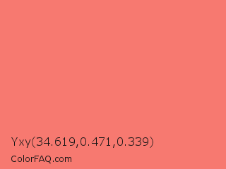 Yxy 34.619,0.471,0.339 Color is a light red color and the nearest color is Coral Reef Hipster Salmon #fd7c6e. Hex code #f77970 and RGB value is rgb(247,121,112). In RGB color space, this color is composed of 97% red, 47% green, 44% blue, In CMYK color space, this color is composed of 0% cyan, 51% magenta, 55% yellow , 3% black , In HSL color space, this color has a hue angle of 4° , 89% saturation and 70% lightness.