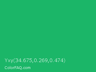 Yxy 34.675,0.269,0.474 Color is a normal green color and the nearest color is Green Crayola #1cac78. Hex code #1bb668 and RGB value is rgb(27,182,104). In RGB color space, this color is composed of 11% red, 71% green, 41% blue, In CMYK color space, this color is composed of 85% cyan, 0% magenta, 43% yellow , 29% black , In HSL color space, this color has a hue angle of 150° , 74% saturation and 41% lightness.