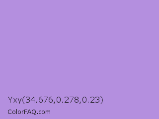 Yxy 34.676,0.278,0.23 Color is a light violet color and the nearest color is Bright Lavender #bf94e4. Hex code #b48fdf and RGB value is rgb(180,143,223). In RGB color space, this color is composed of 71% red, 56% green, 87% blue, In CMYK color space, this color is composed of 19% cyan, 36% magenta, 0% yellow , 13% black , In HSL color space, this color has a hue angle of 268° , 56% saturation and 72% lightness.