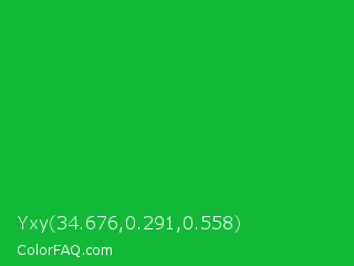 Yxy 34.676,0.291,0.558 Color is a normal green color and the nearest color is Dark Pastel Green #03c03c. Hex code #12b837 and RGB value is rgb(18,184,55). In RGB color space, this color is composed of 7% red, 72% green, 22% blue, In CMYK color space, this color is composed of 90% cyan, 0% magenta, 70% yellow , 28% black , In HSL color space, this color has a hue angle of 133° , 82% saturation and 40% lightness.