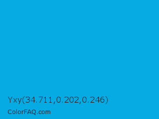 Yxy 34.711,0.202,0.246 Color is a normal blue color and the nearest color is Vivid Cerulean #00aaee. Hex code #06abe3 and RGB value is rgb(6,171,227). In RGB color space, this color is composed of 2% red, 67% green, 89% blue, In CMYK color space, this color is composed of 97% cyan, 25% magenta, 0% yellow , 11% black , In HSL color space, this color has a hue angle of 195° , 95% saturation and 46% lightness.