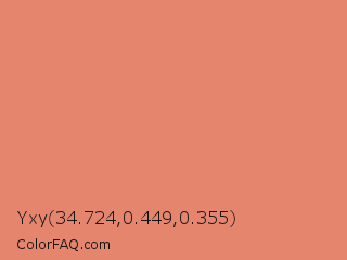 Yxy 34.724,0.449,0.355 Color is a light red color and the nearest color is Middle Red #e58e73. Hex code #e6856e and RGB value is rgb(230,133,110). In RGB color space, this color is composed of 90% red, 52% green, 43% blue, In CMYK color space, this color is composed of 0% cyan, 42% magenta, 52% yellow , 10% black , In HSL color space, this color has a hue angle of 12° , 71% saturation and 67% lightness.