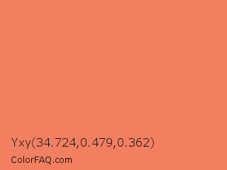 Yxy 34.724,0.479,0.362 Color is a light red color and the nearest color is Big Foot Feet #e88e5a. Hex code #f17f60 and RGB value is rgb(241,127,96). In RGB color space, this color is composed of 95% red, 50% green, 38% blue, In CMYK color space, this color is composed of 0% cyan, 47% magenta, 60% yellow , 5% black , In HSL color space, this color has a hue angle of 13° , 84% saturation and 66% lightness.