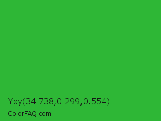 Yxy 34.738,0.299,0.554 Color is a normal green color and the nearest color is Wageningen Green #34b233. Hex code #2eb736 and RGB value is rgb(46,183,54). In RGB color space, this color is composed of 18% red, 72% green, 21% blue, In CMYK color space, this color is composed of 75% cyan, 0% magenta, 70% yellow , 28% black , In HSL color space, this color has a hue angle of 124° , 60% saturation and 45% lightness.
