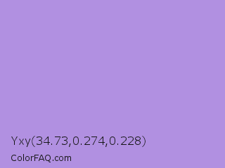 Yxy 34.73,0.274,0.228 Color is a light violet color and the nearest color is Dull Lavender #a899e6. Hex code #b190e1 and RGB value is rgb(177,144,225). In RGB color space, this color is composed of 69% red, 56% green, 88% blue, In CMYK color space, this color is composed of 21% cyan, 36% magenta, 0% yellow , 12% black , In HSL color space, this color has a hue angle of 264° , 57% saturation and 72% lightness.