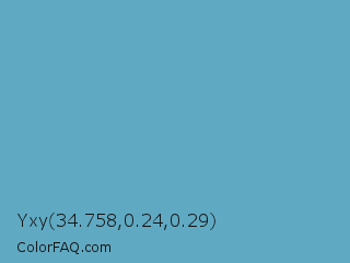 Yxy 34.758,0.24,0.29 Color is a normal blue color and the nearest color is Fountain Blue #56b4be. Hex code #60a9c2 and RGB value is rgb(96,169,194). In RGB color space, this color is composed of 38% red, 66% green, 76% blue, In CMYK color space, this color is composed of 51% cyan, 13% magenta, 0% yellow , 24% black , In HSL color space, this color has a hue angle of 195° , 45% saturation and 57% lightness.