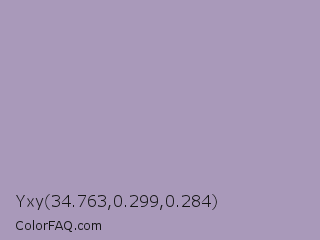 Yxy 34.763,0.299,0.284 Color is a light violet color and the nearest color is Amethyst Smoke #a397b4. Hex code #a999ba and RGB value is rgb(169,153,186). In RGB color space, this color is composed of 66% red, 60% green, 73% blue, In CMYK color space, this color is composed of 9% cyan, 18% magenta, 0% yellow , 27% black , In HSL color space, this color has a hue angle of 269° , 19% saturation and 66% lightness.
