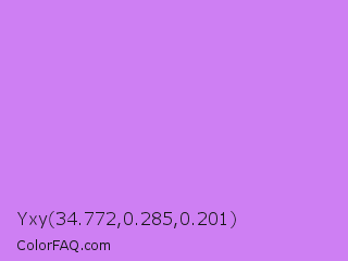 Yxy 34.772,0.285,0.201 Color is a light purple color and the nearest color is Bright Lilac #d891ef. Hex code #ce7ff3 and RGB value is rgb(206,127,243). In RGB color space, this color is composed of 81% red, 50% green, 95% blue, In CMYK color space, this color is composed of 15% cyan, 48% magenta, 0% yellow , 5% black , In HSL color space, this color has a hue angle of 281° , 83% saturation and 73% lightness.