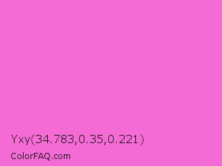 Yxy 34.783,0.35,0.221 Color is a light magenta color and the nearest color is Rose Pink #ff66cc. Hex code #f56bd6 and RGB value is rgb(245,107,214). In RGB color space, this color is composed of 96% red, 42% green, 84% blue, In CMYK color space, this color is composed of 0% cyan, 56% magenta, 13% yellow , 4% black , In HSL color space, this color has a hue angle of 313° , 87% saturation and 69% lightness.